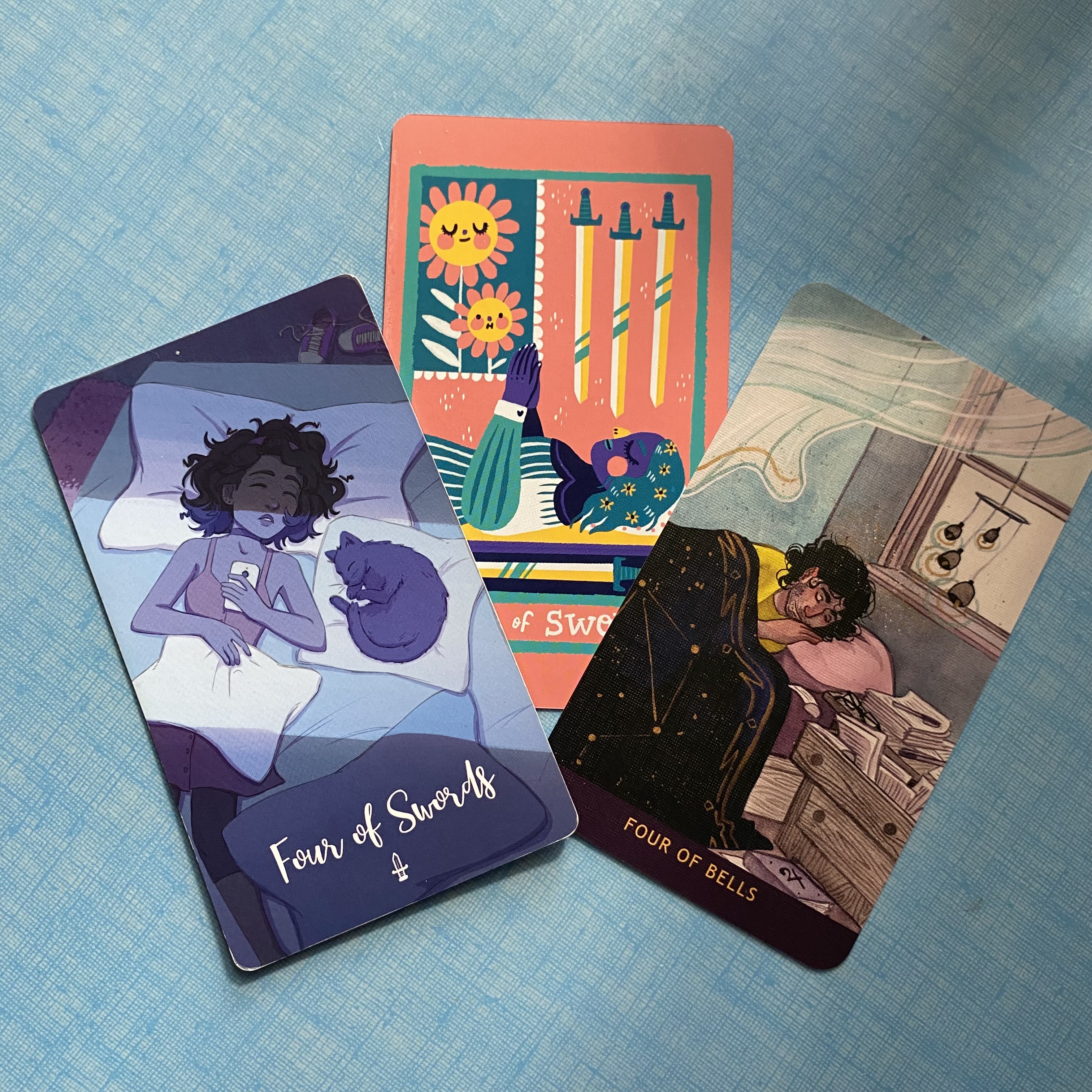 Ce 4 d’épées, il me dit : “hey mais meuf, t’as pas besoin de bosser là, t’as besoin de repos. De dormir, de recharger tes batteries, de prendre soin de toi. Alors arrête de nous gaver avec tes grandes ambitions et va te coucher”.